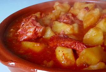 500gr de costillas adobadas1 kilo de patatas 1 pimiento medio pimiento rojo media cebolla1 ñora (pimiento rojo seco)4 o 5 dientes de ajo grandesAceite de olivaUn chorrito de JerezSalCaldo (o agua con una pastilla de caldo)