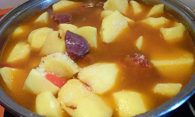 Incorpora las patatas chascadas y cubre de agua. Pon la sal y el pimentón.