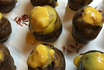 Por último hacemos la emulsión de azafrán. Ponemos en un cazo el zumo de la naranja con el azafrán y unas gotas de vinagre. Dejamos que reduzca ligeramente, aproximadamente durante cinco minutos, le añadimos la yema de huevo. Batimos (emulsionamos) unos segundos para que nos quede cremoso. Con esta emulsión cubrimos por encima la papa con el bacalao.