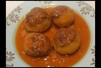 La carne condimentada con sal se pone dentro de las papas y encima de cada papa un poco de harina con el fin de que no se salga el relleno. En una olla freír la cebolla y agregar los tomates; dejar cocinar 15 minutos pasado este tiempo colocar las papas sobre la salsa una al lado de la otra, colocar el romero sazonar y dejar cocinar durante 45 minutos.