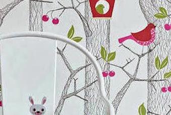 Me encanta este papel pintado, un bosque de cuento con troncos de arboles decorados con cerezas, pajaritos y casitas que transformará su habitación en un lugar encantado. Pero si te decides por este papel tan animado debes de cuidar muchos el resto de decoración de la habitación, eligiendo mueles claros y tapicería muy coordinada.