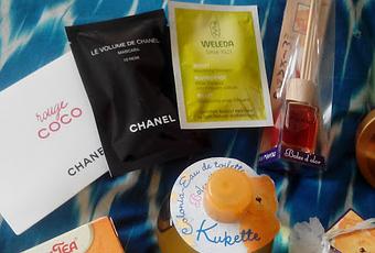 Muestras de labiales y máscara de pestañas de Chanel,champú de Weleda,ambientador infantil de Boles d´olor...