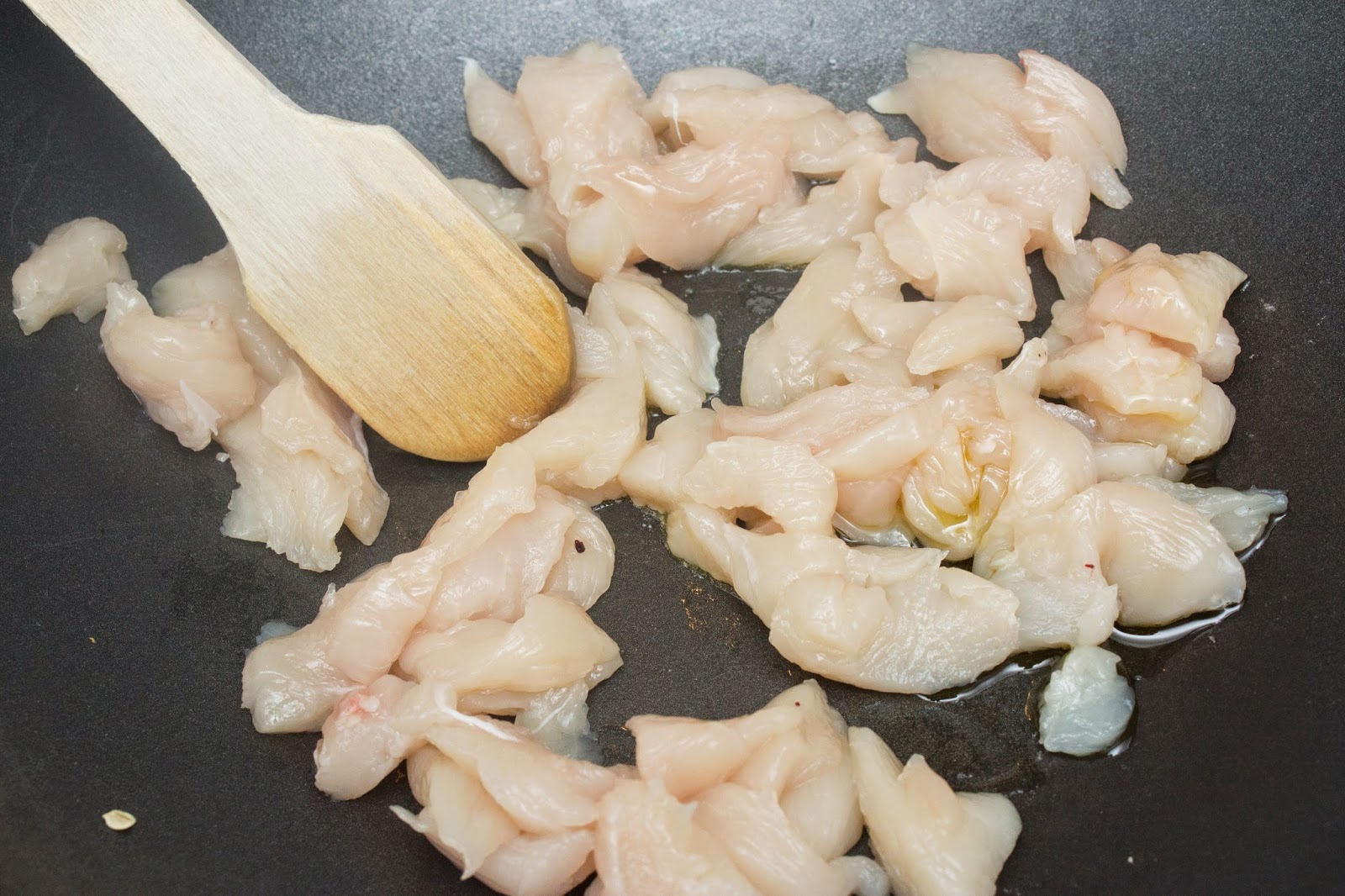 Mientras corta el filete de pollo en tiritas muy finas y las echas a la sartén con un poco de aceite. Deja que se hagan a tu gusto. No los hagas demasiado porque sino luego en el horno quedará demasiado seco.