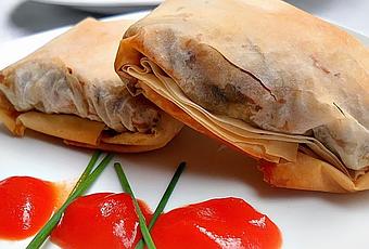 - Vamos doblando la pasta filo sobre él y al final metemos los laterales hacía adentro, por debajo del paquetito para sellarlos bien.