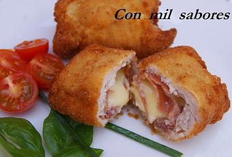 Filetes de pollo.Lonchas de jamón Serrano ó de York(según vuestros gustos).Taquitos de quesos varios.Huevo, pan rallado y harina(para el rebozado).Aceite para freír.