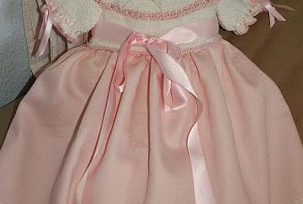 Es un faldón precioso, tanto por el diseño como por los tejidos que lleva. La puntilla es alenson y el entredos que lleva en la falda es muy fino. Puede ir tanto con lazo como con fajín y el fajín y la capota llevan el mismo alensón que el faldón. La tela ya la habéis visto en este otro faldón, es brillantina.