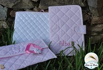 La funda plastificada es blanca con el bies en rosa, acorde al conjunto.