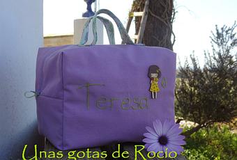 El neceser no tiene derecho y revés, pues ambos lados son igual de bonitos. Por este lado va el nombre bordado y una muñequita de madera.