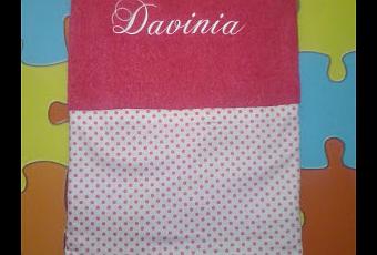 Esta toalla de playa en un precioso color coral, combinada con tela de lunares, volantito y piquillo. Su nombre, bordado en color beig.