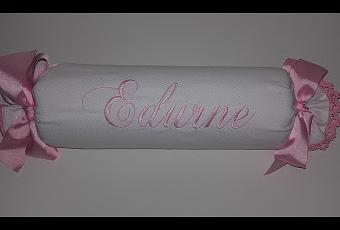 Un tierno caramelito antivuelco para Edurne, en tonos blancos y rosados. Espero que a la mamá le guste.