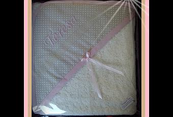 Para Teresa, espero que les guste a sus papás. En felpa beige bordeada y bordada en rosa palo, y bajo el nombre y en crudo, una puntilla que le da un toque más fino.