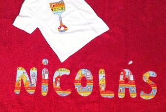 Una camiseta con una aplicación de una palita y una toalla con su nombre aplicado, usando una tela muy veraniega.