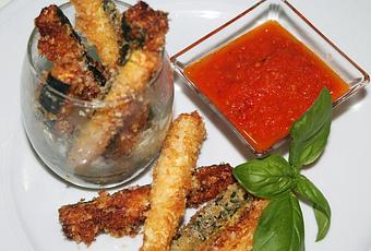 INGREDIENTES (4 pax)3 calabacines grandes (de los verdes)3 huevos300 g. de panko (pan rallado japonés)200 g. de parmesano ralladoSal y pimientaAceite para freírSalsa de tomate para acompañarAlbahaca fresca (opcional)