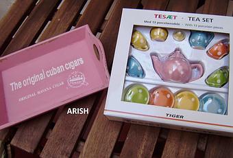 .......y de juguete nada menos; entré en una tienda a mirar un poco porque éra demasiado pronto y tenía que hacer tiempo......... y ahí estaba él.... un maravilloso juguetito de cerámica que me recordaba a uno que tuve de auténtica porcelana china cuando éra niña y que ya no existe porque mi hija también jugó con él cuando éra pequeña y las piezas se fueron rompiendo.... bueno a lo que vamos que me enrollo yo solita..... el caso es que fué amor a primera vista y como no lleva ningún cartel que diga "sólo para niñas pequeñas" (ja, ja, ja) pues me lo compré y cuando llegué a casa entusiasmada con mi tesoro me dí cuenta de que necesitaba una bandejita para colocarlo de ésto hace ya unos meses, pero un día paseando por un centro comercial entré a la tienda Casa y allí encontré la bandeja adecuada, éso sí le voy a cambiar el look que ése anuncio de puros habanos que lleva no me gusta rien de rien