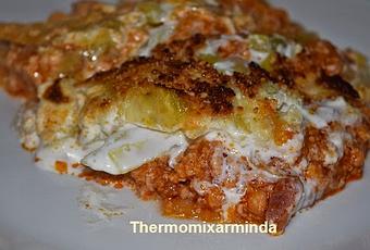 7.-Pasado el tiempo, colocar la mitad del reopollo en una fuente de horno, poner la carne por encima y distribuya por la superficie con la mozarella , cubrir con el resto del repollo, riegue con la nata líquida y espolvoree con el queso rallado.
