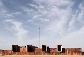 La edificación está construida enteramente con cemento puzolánico de aspecto rojizo, resistente al salitre del suelo árido. Así, el concreto expuesto y el cemento pulido que constituyen su materialidad adquieren un color rojo que se mimetiza con los cerros vecinos, sin necesidad de aditivos o colorantes.