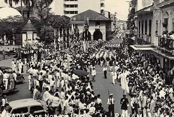 Desfile Patriótico en la Ciudad de Panamá a su paso por la tarima oficial en el Parque de Santa Ana, la cual es ocupada por el Presidente Don Enrique Adolfo Jiménez Brin y miembros del Concejo Municipal y del Consejo de Ministros. Es a mañana del 4 de Noviembre de 1948.