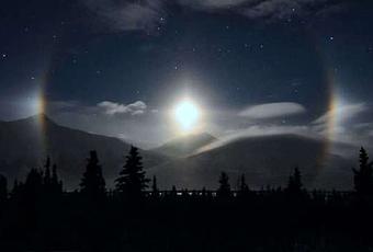 Cerca del horizonte montañoso de poniente se ve un sobre expuesto cuarto creciente de la Luna rodeado por un halo de hielo y flanqueado a derecha e izquierda por unos paraselenes. Análogo a un parhelio, un paraselene está producido por la luz de la Luna refractada a través de cristales de hielo delgados, hexagonales y con forma de plato que hay en las nubes cirrus. Según determina la geometría del cristal, los paraselenes se ven en un ángulo de 22 grados o más de la Luna. En comparación con el brillante disco lunar, los paraselenes son tenues y más fáciles de detectar cuando la Luna está baja.