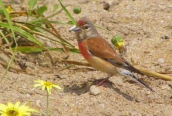 Pero como ya comenté los pardillos comunes no se desplazan solo en parejas, sino que muchas veces es toda la colonia la que se mueve en busca de alimento. Aquí tenemos una foto de un grupito, donde se puede observar la variación en el plumaje de los machos. Esta variación puede deberse a la edad, de forma que los machos más viejos desarrollan las manchas más brillantes.