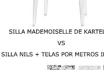 La Silla Mademoiselle de Kartel tiene un parecido razonable con la silla Nils de ikea, con o sin reposabrazos. La de ikea la puedes tapizar con alguna de sus telas por metros para conseguir un parecido mayor.