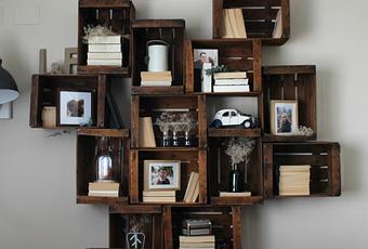 Yo en la pared del salón de mi casa me decanté por una composición estantería hecha con cajas de fruta recicladas (para que no se diga que en casa de herrero cuchillo de palo…). La verdad es que queda preciosa y llama mucho la atención.