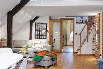 Hay tantos detalles interesantes en este dúplex de 85 m² en total, que no sabe uno donde mirar. Desde la distribución del espacio y los juegos de alturas en cada habitación, a los trozos de pared de ladrillo visto, las ventanas en arco, las vigas de madera que van del suelo al techo o los funcionales tragaluces. Todo está perfectamente encajado, si miramos el plano vemos que no hay ni un centímetro cuadrado desaprovechado, toda la planta es habitable y en lo que concierne a la decoración a pesar de la mezcla de objetos y texturas, hay armonía.