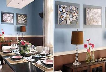 A veces nos planteamos pintar las paredes a dos colores, en el espacio superior e inferior, para así dar otro, exclusivo, aspecto a nuestras paredes.Si cuesta la elección del color, más difícil es la combinación entre ellos. En este caso se ha optado por un color celeste, aproximado al Azul Celeste que nos ayudará a resaltar los elementos expuestos, como son los cuadros y a su vez las lámparas, además aportará luminosidad en la sala. La realización de los cuadros, caseros, nos dá la idea Florencia enHogartotal.com pintando un premarco en grís para realzarlos.En la parte inferior se ha optado por el Mocca limitado por una moldura en blanco. Visualmente se logra integrar el color del mobiliario a las paredes con lo cual el efecto es reducción del espacio, ya que aumentamos la altura de los muebles y a la vez conseguiremos iluminar la estancia.…………………………………………………………………………………………………..Sometimes we think about painting the walls in two colours, in the space above and below, so as to give another unique aspect to our walls.If it costs the choice of colour, the harder it is the combination between them. In this case, we opted for a blue color, approximately Blue that will help us highlight the above features, such as tables and lamps in turn, will bring further brightness in the room. The realization of paintings, homemade, gives us the idea in Florence Hogartotal.comAt the bottom has been chosen by the Mocca , constrained by a white molding. Visually is integrated color of furniture to the walls with which the effect is shrinking space, as we increase the height of the furniture.