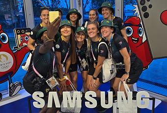Imagen: El equipo de Sudáfrica toma una selfie tras recibir su Samsung Galaxy Z Flip6 Edición Olímpica en el Olympic™ rendezvous @ Samsung | Village Plaza. Crédito de la foto: Samsung.