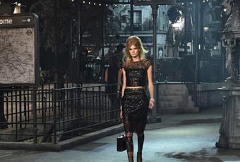 En el interior del Teatro # 5, el estudio preferido de Federico Fellini, Karl Lagerfeld imaginó un París de antaño, recreando la atmósfera de la capital y su ambiente animado. En este escenario en blanco y negro, que recuerda a las de Alexandre Trauner, famoso diseñador Marcel Carné, y las notas de la artista de piano Christophe Chassol, los modelos de miradas esfumadas salieron uno a uno de la estación de metro de Roma, en la línea 5 , llevando zapatos de dos tonos y sandalias de perlas.