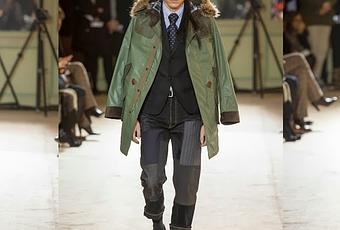 Junya Watanabe sigue su interpretación única de estilo inglés con la exposición de su 2014 la colección la confección para el otoño/invierno. A partir del principio, el diseñador japonés envió un grupo de jóvenes con pelos locos por la pasarela con combinaciones de camisa, corbata y chaqueta tradicionales con los pantalones vaqueros remendados con cierto estilo vagabundo.