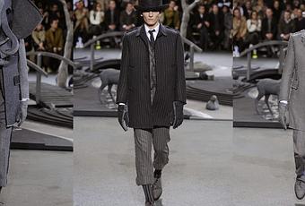 El diseñador mezcló espiga en gris, gris Donegal y Príncipe de Gales tejidos de manera lúdica, a veces haciendo una pierna en un tweed diferente de la otra. Los abrigos eran excepcionales, sus dobladillos cosidos al revés.