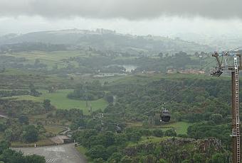 Después de disfrutar un buen rato de tan maravilloso paisaje y de la compañía de uno de los simpáticos elefantes, nos dirigimos hacia la telecabina, muy moderna y toda acristalada. Para nosotros fue un momento mágico, que si nos llegan a poner la banda sonora de Jurassic Park, vemos hasta dinosaurios. Espectacular las vistas desde la telecabina de todo el Parque en medio de ese gran paisaje típico del norte de España.