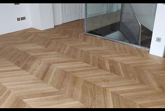 El parquet multicapa en espiga es un material de corte neo-clásico, y con un acabado de brillo casi nulo, confiere un aspecto muy peculiar y atractivo. Esto fue una bonita instalación en Majadahonda, Madrid.