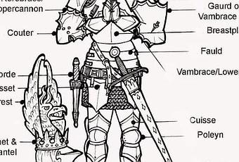 Vamos a empezar practicamente el día (Y el año. De nuevo,Feliz año a todo el mundo!) con esta imagen que ha compartido Grand DM.Es un esquema de las diferentes partes de una armadura de caballero del siglo XV-XVI, con sus nombres en inglés,aunque lo cierto es que muchas de ellas vienen directamente del francés por influencia cultural en esa época. Es una armadura completa y pesada.