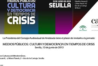 Sevilla, El Consejo Audiovisual de Andalucía celebrará el jueves, 13 de junio de 2013, una jornada dedicada al tema "Medios Públicos: Cultura y Democracia en tiempos de crisis" que tendrá lugar en la Fundación Tres Culturas de Sevilla. El programa del encuentro incluye, entre otras, la intervención de la presidenta de la Alta Autoridad de Comunicación Audiovisual de Marruecos, Amina Lemrinide El Ouahabi, que intervendrá en la mesa redonda sobre el papel de las autoridades reguladoras del audiovisual como garantes del cumplimiento del servicio público de los medios. La asistencia a estas jornadas es gratuita y las personas interesadas tienen de plazo hasta el 11 de junio para confirmar su asistencia a [email protected] El programa del encuentro.pdf carrefour audio visual