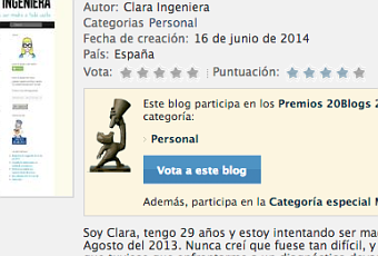 A falta de poco más de una semana para que se terminen las votaciones, aquí estoy yo con mi campaña para conseguir votos. Y es que no sé en qué estaba pensando cuando me apunté a la 9ª Edición de Premios 20blogs que organiza 20 minutos de forma anual.