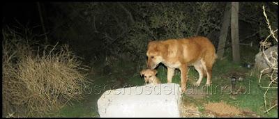 Miro hacia donde creo que viene el ladrido nuevo, hay dos ojitos que me observan detrás de una roca, dos ojitos brillantes que iluminan las sombras. No quiero pensar que hay otro nuevo, pero lo pienso. Trato de no llamar la atención, voy a dejar el agua y alimento donde acostumbro hacerlo, pero no encuentro el pote del agua, pienso que otra vez se lo llevaron. Voy en busca de los cachorritos que en su mini ladrido me llaman. Les dejo alimento, busco el tacho del agua, no lo encuentro. Me devuelvo a mi lugar de partida con la linterna encendida buscando entre los cerros el cuerpo de Marina. Alumbro hacia un lugar, me paralizo, es que no puede ser, ¿como pueden existir personas tan malditas para llevar a cabo tal acto de abandono?...¿Que mierda pasa por sus cabezas para cometer dicho acto?...¿Acaso no tienen hijos, no piensan en ellos antes de llevarlo a cabo?. Frente a mi esta imagen. Una perra golden preciosa, con su pequeña hija. Y digo hija por que la cachorrita viste en su cuello un collar de cuerina color rosado, decorado con perritos metálicos, elegante, de los caros. Quizás en la foto no se le note.