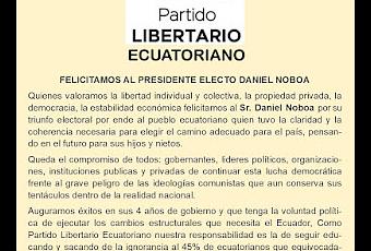 Nadie espera que este gobierno sea el mejor del mundo, eso está claro, tampoco el mismo ha dado señales de serlo, pero si llega a realizar al menos la mitad de las acciones que el Ecuador necesita, será ya un triunfo en un país destrozado por la inseguridad, la delincuencia, la corrupción heredada y la falta de servicios básicos. Pero bueno, eso no era el tema de este post, sino que entre tanta basura de las redes sociales encontré un pronunciamiento de un tal Partido Libertario Ecuatoriano, que no se si ya sea un movimiento político ya establecido o sea un proyecto a futuro, pero lo que pronuncia en ese mensaje parece reflejar mas o menos lo que opinan los 5 millones 700 mil ecuatorianos que apoyamos al Sr. Noboa; así que mejor paso a publicarlo y que reciba las opiniones que se merezca.
