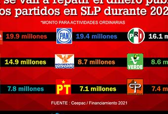Un partido que desapareció a nivel nacional, pero que en San Luis Potosí tiene el registro estatal, se estará llevando 7.8 millones de pesos, el PT obtendrá 7.1 millones y finalmente el Partido Conciencia Popular estará recibiendo este 2021 7.4 millones de pesos.