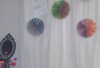 Diseñamos las invitaciones, los letreritos, el photocall, los abanicos colgantes, la mesa de dedicatorias y escogimos mantel, palomiteros y guirnaldas.