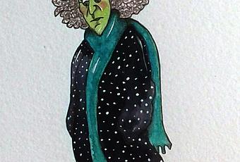 Angustias luce "El abrigo de la noche", una prenda gruesa pero ligera, con amplios bolsillos para esconder sapos y ranas. Como curiosidad diremos que es muy práctico para montar en escoba puesto que es un abrigo-pantalón.Zapatos prestados por la bruja del Este. Bufanda verde esmeralda de la ciudad de Oz.Peluquería colaboradora: "Canas forever"
