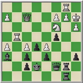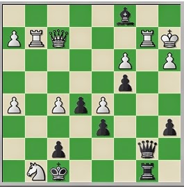 29...Rf8?! [Pero tampoco valía: 29...Rd7 30.c3 Ac1+/- Houdini 4 Pro w32. 31.Tg2! Txb2+ 32.Txb2 Axb2 33.Dxb2 Dxb2+ 34.Txb2 Txg8 35.Tb7+ Rc8 36.Txf7+/- Karsten Müller. 36...Th8 37.f6 Txh5 38.Ta7 Txh2+ 39.Rb1 Tf2 40.f7 Rd8 41.Rc1+- Houdini 3 Pro w32. Y veamos un nuevo enfrentamiento entre módulos que lo corrobore: 41...a5 42.a4 Tf3 43.Rd2 Tf1 44.Re3 Tf6 45.Txa5 Re7 (45...Txf7? 46.Ta8+ Re7 47.Ta7+ Rf8 48.Txf7+ Rxf7 49.a5+-) 46.Ta7+ Rf8 47.a5! Tf1 48.a6 Te1+ 49.Rf3 Ta1 50.Re4 Rg7 Y ahora hay una manera muy sutil de ganar: 51.f8D+! Rxf8 52.Rf5+- e4 53.Rxe4 Re8 54.Rf5 Rf8 55.Re6 Ta2 56.Rxd6 Rg8 57.Ta8+ Rg7 58.a7 Ta5 59.Rc6 Ta6+ 60.Rc5 Ta5+ 61.Rxc4 1-0 (80) Houdini 4 Pro w32-Komodo TCECr 32-bit Intel Core 2 Quad Q6600 2.40 - Nivel de juego: 40 jugadas en 2 h 30' / ¡sin finish! - 2014. ] 30.c3?? "Grave error provocado por los apuros de reloj, algo muy frecuente en las partidas de Bobby (!?). Sus rivales suelen siempre apurarse de tiempo y él no". Kmoch. [Ganaba de inmediato: 30.b4! cxb3+ 31.cxb3!+- Houdini 4 Pro w32. 31...Txb3 (31...Dxd5 32.Cxh6 Txb3 33.Tg8+ Re7 34.f6+ Rd7 35.Df5+ Rc7 36.Tc8+! Txc8 37.Txb3 Dd2+ 38.Tb2 Dxh6 39.Tc2++- Kmoch.) 32.Cxh6 Txb1 33.Tg8+ Re7 34.f6+ Rd7 35.Df5+ Rc7 36.Dc2+ Rd7 37.Txb8 Dxb8 38.Dc6+ Rd8 39.Cxf7# Karsten Müller.] 30...Ac1!= Y de esta forma, Bobby pasó de una posición perdida a otra igualada; pero su rival no fue capaz (como tantas veces ocurre) de adaptarse a la nueva situación y pronto pasará de una posición igualada a otra perdida. ¡La diosa Caissa siempre está al lado de los mejores!... . 31.Tg2?? Obsesionado con proteger "b2" Mednis yerra y cae fulminado. [Tampoco valía ahora la jugada ganadora de antes: 31.b4? porque tras 31...cxb3+ 32.Ra1 sigue 32...b2+! 33.Ra2 y ahora 33...Dxd5+-+ ganando. Kmoch.; Sin embargo se imponia: 31.Cf6! con dos posibilidades que llevan a las tablas: 31...Re7 (31...Txb2+ 32.Txb2 Dxb2+ 33.Dxb2 Txb2+ 34.Ra1 Txh2 35.Txc4 Axa3 36.Ce4= Karsten Müller.) 32.Ch7 Txb2+ 33.Txb2 Dxb2+ 34.Dxb2 Txb2+ 35.Ra1 Txh2 36.Txc4= Houdini 4 Pro w32.] 31...Txb2+-+ Bobby ya no soltará a su presa. 32.Txb2 Diagram