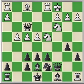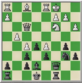 La teoría de la variante estaba evolucionando y Bobby actúa aquí como había jugado contra Gligoric a mediados de aquel año, tanto en Zurich como en el Torneo de Candidatos; este último, "auténtico" y no las "miniaturas" de Torneos de Candidatos que se hacen ahora en la FIDE "mal" gobernada de Ilyumzhínov y Makropoulos que en su quehacer diario sólo buscan obtener dinero fácil, montando "torneítos" así. "Pelotazos" que en esta crisis actual, cada vez cuelan menos en esta sociedad, cansada ya de ver cómo de mal se hacen las cosas; por quienes tienen la responsabilidad de hacerlas bien... . Señores de la FIDE: QUEREMOS TORNEOS ZONALES, TORNEOS INTERZONALES, TORNEOS DE CANDIDATOS CON FORMATOS DE MATCHES LARGOS Y CAMPEONATOS DEL MUNDO A 24 PARTIDAS Y TODOS A CUARENTA JUGADAS EN 2 HORAS Y MEDIA Y SIN FINISH, ES DECIR, CON APLAZAMIENTOS; ASÍ QUE PÓNGANSE LAS PILAS Y SI NO SABEN ORGANIZAR EL AJEDREZ MUNDIAL, PUES DÉJENLO. Hay una manera muy sencilla y fácil de hacer todo ésto: Que la mayoría de las nóminas mensuales de todos los "grandes" dirigentes del ajedrez mundial, bajen; así como las jugosas comisiones que ganan por organizar esos "torneítos" (que no grandes torneos). Seguro que sobraría entonces el dinero para hacer bien las cosas, "responsabilidad" ésta (Y NO OTRA) - insistimos - para la que han sido elegidos. [11...Cxf6] 12.a3!? Visto lo que ocurre en la partida, más que interesante parece una muy buena jugada. Contiene a las negras y luego permite que las blancas evolucionen favorablemente en el flanco de rey. [12.f5! Ce5 13.Dh3 0-0 14.Cce2 Rh8 15.Cf4 Tg8 16.Tg1 d5 17.fxe6 dxe4 18.Cd5 Dc5 19.Cxe7 Dxe7 20.Cf5 Dxe6 21.Dh6 Ad7 22.Td6 Cxg4 23.Txg4 Dxf5 24.Txg8+ Txg8 25.Txf6 Dd5 26.Td6 Df5 27.Tf6 Dg5+ 28.Dxg5 Txg5 29.Txf7 Ag4 30.Rd2 Af3 31.Re3 Tg1 32.Ah3 Te1+ 33.Rf4 Ad1 34.Re5 e3 35.Af5 Tg1 36.Txh7+ Rg8 37.Tc7 Ag4 38.Axg4 Txg4 39.Tc3 e2 40.Te3 Tg2 41.Rd4 e1D 42.Txe1 Txc2 43.Tb1 Rf7 44.a3 Re6 45.b3 Txh2 46.Rc5 Rd7 47.Rb6 Ta2 48.Rxa6 Txa3+ 49.Rb7 Rd6 50.Rb6 Rd7 51.b4 Th3 52.Tc1 Th8 53.Rxb5 Tb8+ 54.Ra4 Ta8+ 55.Rb3 Tc8 56.Txc8 Rxc8 57.Rc4 Rb8 ½-½ (57) Gligoric,S-Fischer,R Bled/Zagreb/Belgrade (25) 1959; 12.Ad3!?; 12.Ag2 Ab7 13.The1 0-0-0 14.a3 Cb6 15.Td3 Rb8 16.Ted1 d5 17.exd5 Cxd5 18.Cxd5 Axd5 19.Df1 Ac5 20.Axd5 Txd5 21.Ce2 Txd3 22.Txd3 h5 23.gxh5 Txh5 24.Dg2 Th8 25.Tc3 Tc8 26.b4 Ae3+ 27.Rb1 Db6 28.Txc8+ Rxc8 29.Df3 Rd8 30.h4 Re7 31.h5 f5 32.h6 Ad4 33.Cxd4 Dxd4 34.Dh1 Dh8 35.h7 Rf8 36.Da8+ Rg7 37.Dxh8+ Rxh8 38.c4 Rxh7 39.c5 1-0 (39) Gligoric,S-Fischer,R Zurich 1959] 12...Ab7 [La "Escuela Soviética" siempre estaba buscando (filosofando!) y resulta curioso que ya señalen aquí la siguiente alternativa: 12...Tb8!? Equipo de maestros soviéticos: Smyslov, Tal, Yudasin y Tukmakov; liderados por Sergei Soloviev.] 13.f5! Ahora este movimiento es más fuerte porque el peón de rey de las negras no está protegido por su alfil de dama. Kmoch. N.d.l.r.: ¡Interesante apreciación!. [13.Ag2 0-0-0 14.The1 traspone a la partida Gligoric-Fischer de Zurich 1959, vista anteriormente. ] 13...e5 [Prueba de lo incómodo que era la variante para las negras, resulta el siguiente ejemplo, que no vale: 13...Ce5? 14.Dh3!+/- Equipo de maestros soviéticos liderados por Soloviev. Y como fue jugado en la partida Gligoric-Fischer del Torneo de Candidatos de 1959, antes mencionada y que obliga a (14.De2!? Ac8+/= Houdini 4 Pro w32.(14...Dd7? 15.g5! fxg5 16.fxe6 fxe6 17.Ah3+- Equipo de maestros soviéticos liderados por Soloviev.) ) 14...Ac8+/- con verdaderos problemas para las negras. Kmoch.] 14.Cde2!N Este era el "cilindro" con el que vino Edmar Mednis, todo un gran "teórico" del ajedrez mundial a la partida. [14.Cb3 Tc8 15.Td2 Cb6 16.Rb1 Cc4 17.Axc4 bxc4 18.Cc1 Tb8 19.Cd5 Axd5 20.Txd5 Db6 21.Dc3 0-0 22.Ce2 Rh8 23.Cg3 Tg8 24.h3 Tgc8 25.Thd1 Tc6 26.Ra2 Db7 27.Tb1 Tb6 28.Cf1 Tc8 29.Ce3 Dc6 30.Tdd1 Tb5 31.Cd5 Db7 32.De3 Tb8 33.b4 cxb3+ 34.cxb3 Tc5 35.Tb2 Dd7 36.g5 fxg5 37.f6 Txd5 38.Dxg5 Tg8 39.Dxg8+ Rxg8 40.Tg1+ Rf8 41.fxe7+ Rxe7 42.exd5 Dxh3 43.Tc1 Df3 44.Tc7+ Rf6 45.Tc6 Dxd5 46.Txa6 e4 47.Ta4 Re5 48.Tc4 f5 49.Tc1 e3 50.Ra1 Dd3 51.Ra2 f4 52.b4 Db5 53.Tb3 Re4 54.Th1 h5 55.Rb2 De2+ 56.Ra1 f3 57.b5 f2 58.b6 f1D+ 59.Txf1 Dxf1+ 60.Ra2 Df8 0-1 (60) Nikitin,A-Suetin,A URS-ch sf Leningrad (14) 1957] 14...Cb6 15.Cd5!? [Sin embargo el módulo informático prefiere: 15.Cg3! Dc5+/= Houdini 4 Pro w32.] 15...Axd5 16.exd5 Tc8 17.Cc3 Diagram