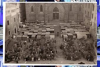 La fotografía es una imagen de la Fira de Santa Llúcia tomada en el siglo XIX. Obsérvese que aún no existía la plaza de la Catedral, ya que los edificios circundantes -derribados hace muchos años- se asoman prácticamente a la escalinata, estando montadas las paradas de la feria sobre los mismos escalones y el rellano que da acceso al pórtico catedralicio.