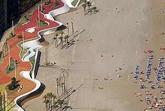 Inspirado en la naturaleza y en el entorno y con formas y colores que remiten a Gaudí o a Burle Marx, el nuevo Paseo Marítimo de la Playa de Poniente, en Benidorm, del estudio barcelonés de Carlos Ferrater, se proyecta como un espacio de transición entre la costa y el núcleo urbano. No se entiende como frontera-borde sino como espacio intermedio que permeabiliza esta transición.