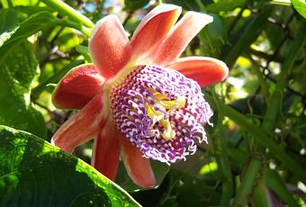 La palabra passiflora proviene del latín passio (pasión) y floris (flor). Bautizada así por los jesuitas españoles quienes encontraron gran semejanza entre los elementos de la flor y diversos instrumentos de la Pasión de Cristo: su corona floral que se asemeja a la corona de espinas, sus estambres a las cinco llagas, su pistilo a la cruz, los estigmas a los tres clavos y las brácteas a la Santísima Trinidad.A la pasiflora también se le conoce con otros nombres como flor de la pasión, pasionaria, maracuyá, granadilla, curubo, banana passion-fruit, mburukuyá, mburucuja, parcha, entre otros.