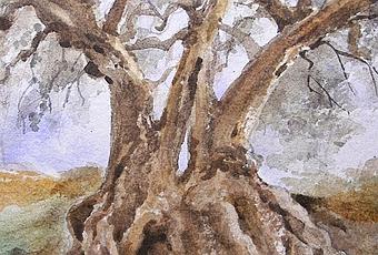 Una vez seco, se empieza a calentar la cosa con sienas, natural y tostada, prurando aplicarlas muy diluidas y trasnparentes en algunas zonas y pinceladas más secas y espesas, rápidas, sin demasiado cuidado, pero procuranzo rozar solo el papel para que la textura del papel deje rugoso y texturado el trazo. Se intenta conseguir el relieve y la rugosidad, la textura áspera de la cortea de el olivo, tanto on el tipo de pincelada como por la granulación de los pigmentos. Daniel Smith y Kremer son lo mejor para eso. También se mezcla el azul con los sienas para obtener un tono más oscuro sin añadir colores nuevos.