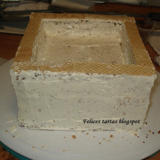 De las obleas que se ponen en los helados tipo sandwich, se van cortando tiras para poner por todo el borde del bizcocho, de manera que quede más cuadradito.