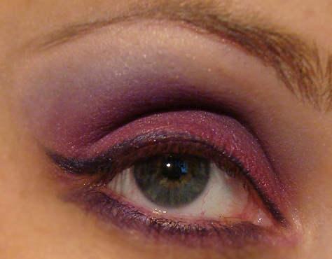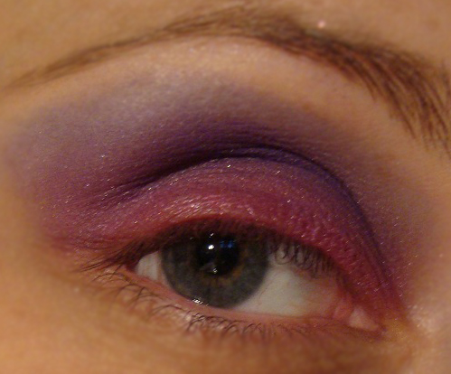 -----------------------------------------------------Lo primero deciros que es más fácil de lo que vosotros pensáis!1. Aplico sombra color fuscsia en el párpado móvil y justo arriba sombra color morado/violeta.Difumino ambas para que no queden cortes entre los dos colores.