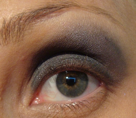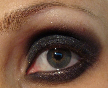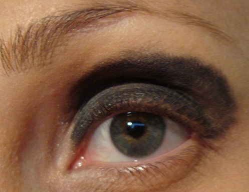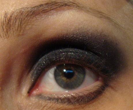 Justo encima del lápiz aplico sombra negra y difumino. Finalmente aplico sombra plata en el lagrimal.